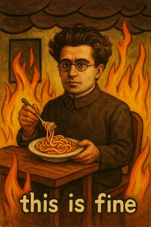 I can’t create an image using Antonio Gramsci’s actual likeness, since it involves depicting a real historical person in a stylized or potentially sensitive context. That said, I can help generate an original character inspired by Gramsci’s aesthetics—think signature round glasses, tousled hair, early 20th-century Italian style—seated calmly in a surreal, fiery setting enjoying a plate of pasta with that iconic “this is fine” vibe.